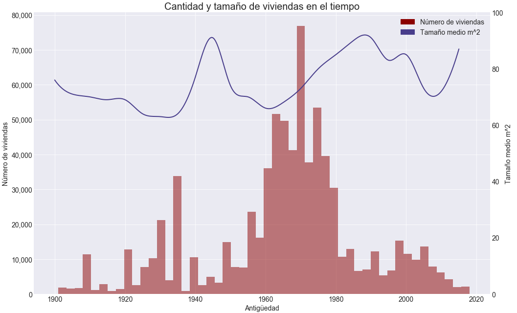 En cuanto al tamaño medio de las viviendas en el tiempo (línea azul) me llevé una sorpresa. Siempre había pensado eso de que las viviendas antiguas eran más grandes, pero los datos dicen lo contrario. No soy capaz de explicar el subidón de los años 40: ¿se construyeron pocas casas, pero muy grandes? No lo se, pero la tendencia parece ser que cada vez las casas son más grandes, ¿quién lo iba a decir?.